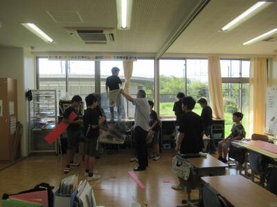 にじ組 総合的な学習の時間に再生可能エネルギーなどの環境問題について学んでいます。今日はみんなで協力して教室の窓に断熱フィルムを貼りました。遮熱効果があるかを検証します。