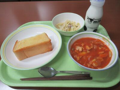 給食 はちみつレモントースト、秋の味覚シチュー、キャベツのペペロンチーノソテー、牛乳 でした。