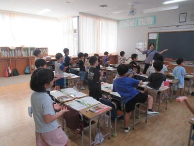 1年生 国語の物語文を読み、その様子を体を使って表していました。