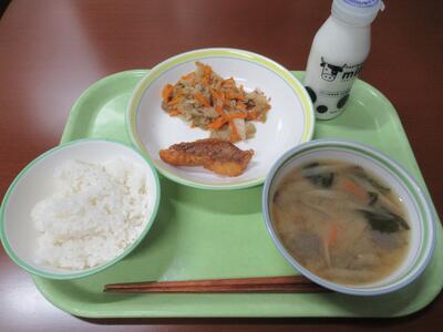 給食 ごはん、味噌とりごぼう汁、赤魚の和風あん、野菜のおかか炒め、牛乳 でした。