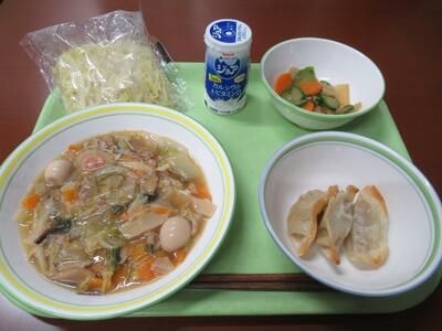 給食 あんかけ焼きそば、焼き餃子、華風きゅうり、ジョア でした。