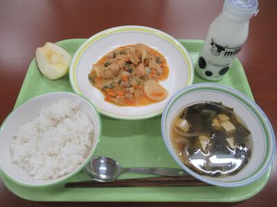給食 ごはん、わかめスープ、チーズタッカルビ、りんご、牛乳 でした。