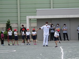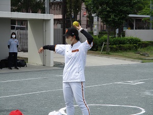 ゴールデンウィークが終わりました。(と言っても、明日、明後日は休みですが。)大型連休のためか、子供たちはし少し落ち着かないようでした。そんな中ですが、今年も4年生対象に読売ジャイアンツの野球教室(ジャイアンツアカデミー)が行われました。今回も「投げる」に焦点をあて、投げるコツをしっかり教わりました。肘を肩よりも高く上げること、体を回転させて投げること。何回も投げる練習をした後は、さっそくゲームです。打つことはせず、投げたボールが戻ってくるまでに何塁まで行けるかで得点が入ります。誰でもできる簡単なルールですので、子供たちは楽しみながら参加できました。サプライズが2つあります。写真を見て気づきましたか?なんと!TVでお馴染みのジャイアンツの大投手宮本和知さんが来てくださいました!宮本さんは、ジャイアンツアカデミーの校長先生をやられているようです。もちろん子供たちにも優しく声をかけ、アドバイスをしていただきました。もう一つのサプライズは、帽子です。2年前のジャイアンツアカデミーで全校児童の分をいただきました。もらえるのは一度だけなのですが、今回デザインが変わり新調されたので、再度全校児童分いただけることになりました!(太っ腹!)後日学校に届きますので、もうしばらくお待ちください。