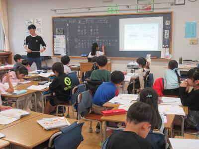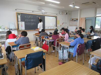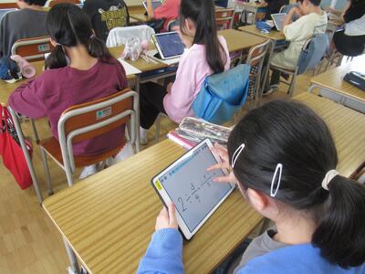 6年生 算数では分数のわり算の学習をしています。約分トレーニングの後、帯分数や整数を含むわり算にも挑戦しました。