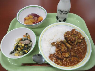 給食 夏野菜のキーマカレー、キャベツとコーンのソテー、ブリーベリーフルーツポンチ、牛乳 でした。