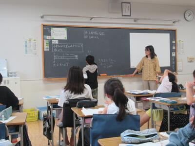 5年生 算数では小数のわり算を学習しています。あまりの大きさと、あまりの求め方について考えました。