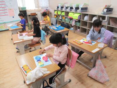 にじ組 図工ではカラフルな魚の絵を仕上げました。終わった人は粘土工作をしていました。