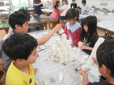3年生 図工ではグループで協力して芸術性と高さのあるタワーを作りました。意見がまとまらないグループもありました。