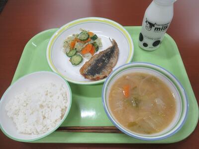 給食 ごはん、味噌ちゃんこ汁、いわしのかば焼き、野菜のゆかり和え、牛乳 でした。