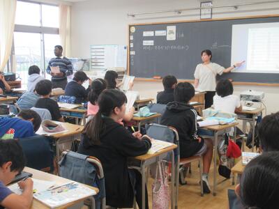6年生 外国語活動では、「何時」に「何を」するかという英語表現について学んでいました。