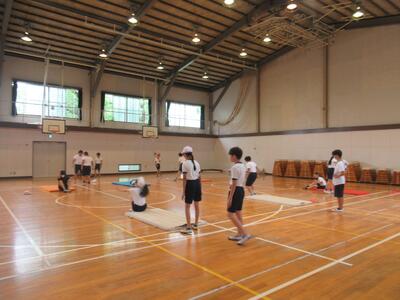 6年生 体育ではマット運動をしていました。いろいろな技に挑戦しました。