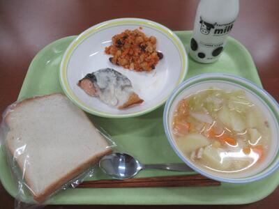 給食 イギリスパン、野菜のスープ煮、ますのガーリックマヨソース、チリコンカン、牛乳 でした。