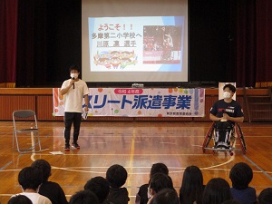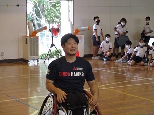 アスリート派遣事業が行われました。東京都の小中学校から50校しか選ばれない事業に、多摩第二小が見事選ばれたのです!今日、お越しいただいたアスリートの方は、川原 凜 選手です。車いすバスケットボール日本代表選手で、東京2020では、銀メダルを獲得しました。また、現日本代表のキャプテンを務めています。4~6年生を対象に行ったトークショーは、子供たちから出された質問に答える形式で行われました。車いすバスケットボールの魅力や練習について、日常生活のことまで、とても詳しく丁寧にお話ししてくださいました。印象的だったのは、日常生活で困っていることはないとのことでした。生まれつき脊髄に病気をもっていたため、小さいころから車いす生活なので、何とも思わないのだそうです。自分自身が普通に考えている当たり前にとらわれてはいけないことを改めて感じました。トークショーの中では、ファシリテーターを務めた醍醐先生と筋肉比べをする場面もありました。(写真がボケてしまいすみません。)モリモリの肩と腕の筋肉に、子供たちからは歓声が上がっていました。模範演技では、車いすの扱いやスピード、シュートのすばらしいこと!それを間近で見られた子供たちは幸せ者です。最後に子供たちへ向けて川原選手からメッセージをいただきました。「自分が好きなことを見つけて、それを楽しみながら努力をしていってほしい。ぜひ、夢中になれるものを見つけてください。」川原選手、ありがとうございました。実技体験は、6年生が行いました。競技用の車いす体験とシュート体験です。思うように動いてくれない車いすに苦戦したり、座ったままだと力が入らずゴールまでボールが届かなかったり、パラスポーツならではの体験ができました。最後に校長室では、銀メダルを間近で見せていただき、色紙をいただき、記念撮影を行いました。(私もツーショット写真をゲットしました!)サイン、分かりますか?「りん」と書かれています!!終わった後、すぐにお車で千葉県までお帰りになった川原選手。帰ってすぐに練習だそうです!本当にありがとうございました。ご活躍をお祈りしております!