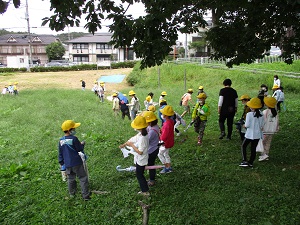 1年生が並木公園に虫とりに出かけました。雨が心配されましたが、降られることなく虫とりを楽しみました。また、並木公園は1週間ほど前に草刈りがされたばかりなので、たくさんはとれないだろうなあと思っていましたが、少し奥の草刈りがされていないところに行くと、たくさんのバッタや蝶がいました。つかまえるたびに歓声を上げる子供たち。中には10cmを超えるような大物をつかまえた子供もいました。雨が降り出す前に教室に戻り、じっくり観察できました。ぜひ、虫とりの様子をお子さんから聞いてみてください。今日からしばらくぐずついた天気になり、気温も下がるようです。寒暖差で体調を崩さないようお気を付けください。