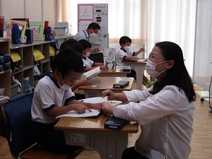 写真が少なくてすみません。にじ組1年生、国語「やくそく」の授業の様子です。カタカナの学習の後、全文を読み、あおむし達がした「やくそく」を読み取ります。いろいろな意見が出る中、家族や仲間を思いやる発言がたくさん出ました。みんな優しい!書けるようになった文字も増え、温かい雰囲気の中で楽しく学習し成長していることを実感できました。