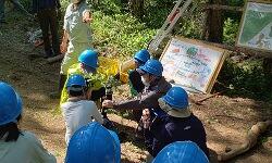 間伐のために、子供たちが木を切り倒す体験をしています。合計8本の赤松の木を指導者の方にサポートしていただきながら、林業の仕事を味わいました。木が倒れる瞬間は、圧巻で、子供たちからも歓声があがりました。