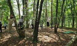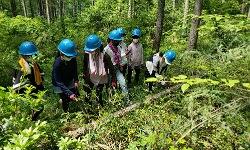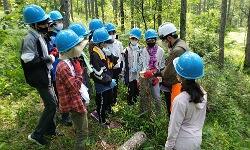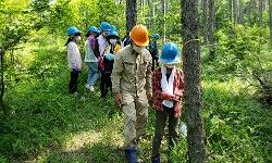 宿舎でお世話になっている五味さんの説明を受けて、これから林業体験に向かいます。陽射しに輝く木々の中を体験するところまで移動します。