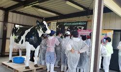 続いて、酪農です。お世話用の衣服を着て、乳牛について学びました。乳しぼりを体験し、次は牛のお世話です。
