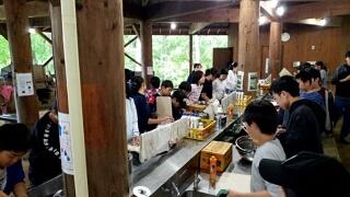 林業体験でお腹を空かせて、昼食の会場へ。夜、バーベキューをするところで、おにぎりと豚汁をいただきました。自然に囲まれたところでの食事は、美味しさも高まります。