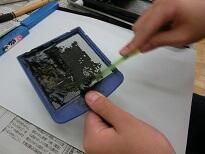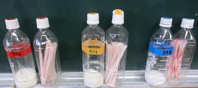 汚れのサンプルを水に入れてかき混ぜ棒でよく混ぜました。