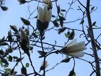 ご近所さまからずいぶん遅れて校舎北側のコブシが咲き始めました。