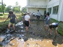 水を張って泥を足でこねて、底を固めて田んぼの水漏れを防ぎます。