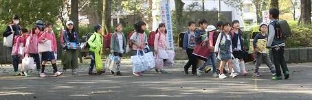 それぞれ班の集合場所から班ごとに並んで学校まで来ます。