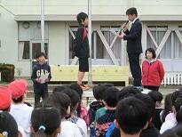 体育館が卒業式で使えないので校庭で朝会をしました。