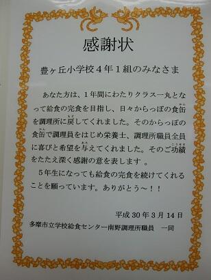4年1組 給食完食感謝状