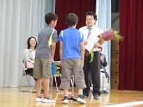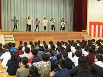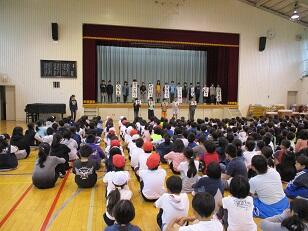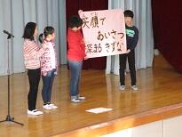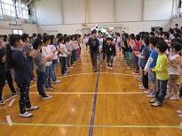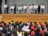 全校で監督・選手を迎えた後、6年生が学校紹介をしました。