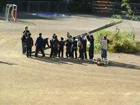 9時15分、トラック到着。竹をおろして、やぐらの柱を立てます。