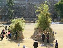 横組みをして縄で結わきます。やぐらの中と周りに木や枝、門松を入れ、周りにワラを置いて燃えやすくします。