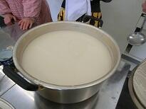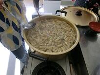 大きな柄杓(ひしゃく)と大きなスパテラで調理します。スパテラは2人が向かい合って2本で力を合わせないと混ぜられません。