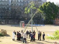 9時15分、トラック到着。竹をおろして、やぐらの柱を立てます。