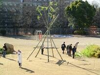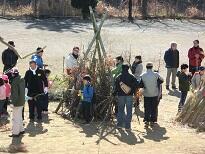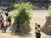 横組みをして縄で結わきます。やぐらの中と周りに木や枝、門松を入れ、周りにワラを置いて燃えやすくします。