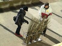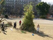 1月13日。朝8時。ボランティアの受付が始まり、まゆ玉を付ける篠竹とやぐらを立てる竹を取りに行きます。