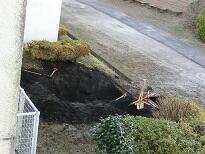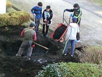 一輪車で灰を運び、午前中に掘った穴に埋めます。