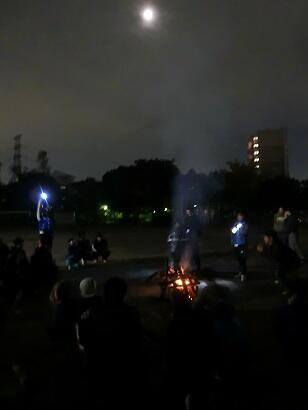 19時15分。食後の片付け、ノートに記録をした後、校庭でキャンプファイヤー。