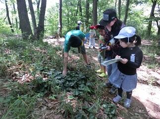 学校林入口の階段教室を使ってオリエンテーション 絶滅危惧種のタマノカンアオイの解説