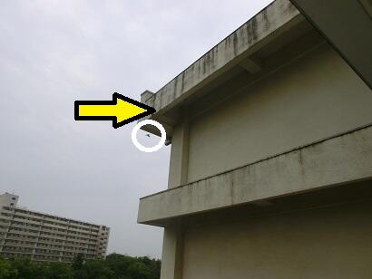 巣をつくっているのは矢印の裏。人からは見えないところに作っています。さすがです。