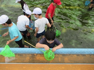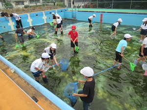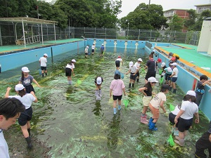 3年生が、理科の学習で、ヤゴ取りをしました。プールの水を排水して、低い水位のプールに、虫かごを持って入り、軽快に泳いでいるヤゴをとりました。子供たちの嬉しそうな声が、プールに響いていました。これから、教室で観察し、成長を見守ります。虫が大好きな子はもちろんのこと、苦手な子も「かわいい」「大きくなあれ」と願いを込めていました。理科の勉強と同時に、小さな命を大切にすることも勉強します。
