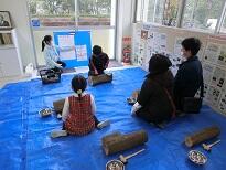 2月9日。体験交流型学習発表会「とよぱあく」で5年生がしいたけのコマ打ち体験のブースを開きました。