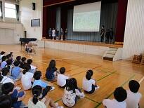 5月17日、学校林公開週間で大活躍した学校林委員会が児童集会で発表しました。