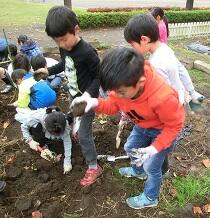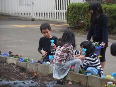 学校に戻り、苗と球根を植えました。土をたっぷり入れて、水をやりました。