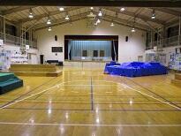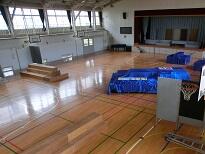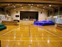 囲炉裏を囲んで 石臼挽き体験 旧西落合中学校の体育館は昔の物でいっぱいです。