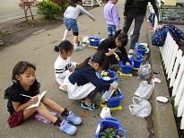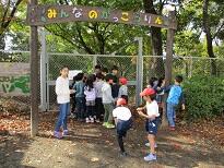 低学年の子どもたちが「かわいい」といって、なでたり餌をやったりしています。