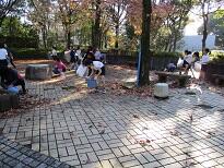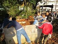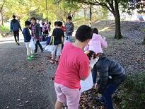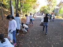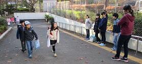 6年生はふれあい月間の取組を振り返り、自分たちで遊歩道の落葉拾いをしながら、