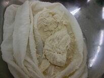 呉を煮立てます。沸騰したら弱火にして8分。さらしで作った袋に入れて絞ります。