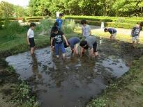 水を張って泥を足でこねて、底を固めて田んぼの水漏れを防ぎます。