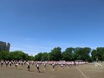 校庭で準備運動、コオーディネーショントレーニングをしてから、たてわり班に分かれます。